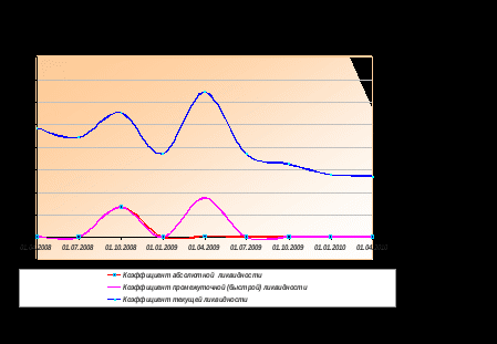 Коэффициент абсолютной ликвидности Коэффициент абсолютной ликвидности показывает, какая часть краткосрочных обязательств может быть погашена немедленно, и рассчитывается как отношение наиболее ликвидных оборотных активов к текущим обязательствам предприятия. Рекомендованное значение данного коэффициента – от 0,2 до 0,5. Как видно из таблицы, данный коэффициент имеет рекомендуемое значение только на одну отчетную дату - 01.10.2008 г., на остальные отчетные даты значение коэффициента практически равно 0. Это означает, что погашение текущих обязательств немедленно за счет абсолютно ликвидных активов - денежных средств и краткосрочных финансовых вложений невозможно. Критический коэффициент ликвидности Критический коэффициент ликвидности или иначе коэффициент промежуточного покрытия характеризует ту часть текущих обязательств, которая может быть погашена не только за счет денежных средств, но и за счет ожидаемых поступлений за отгруженную продукцию, выполненные работы или оказанные услуги (за счет краткосрочной дебиторской задолженности) и определяется как отношение ликвидных активов к текущим обязательствам предприятия. Рекомендуемым значением данного коэффициента считается 0,8-1,0. Коэффициент промежуточного покрытия отражает прогнозируемые платежные возможности организации при условии своевременного проведения расчетов с дебиторами. Значение коэффициента промежуточного покрытия в течение всего анализируемого периода имеет значения, близкие или равные 0, что свидетельствует о неспособности покрытия текущих обязательств предприятия наиболее ликвидными активами. Коэффициент текущей ликвидности Коэффициент текущей ликвидности (коэффициент общего покрытия) позволяет установить, в какой кратности оборотные активы покрывают обязательства предприятия. Рекомендуемое значение от 2,0 до 2,5. Коэффициент покрытия показывает платежные возможности организации, оцениваемые при условии не только своевременных расчетов с дебиторами и благоприятной продажи продукции, но и продажа в случае необходимости оборотных средств. В течение всего анализируемого периода данный коэффициент ни разу не принимал нормативных значений и варьировал от 0,54 до 0,97. Это означает, что погашение кредиторской задолженности за счет оборотных активов невозможно.