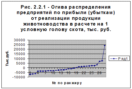 Из данных таблицы видно, что 18 предприятий из 30 являются убыточными 12 прибыльными. Самым убыточным является предприятие СХК "Победа" Тутаевского района, убыток которого составляет - 7111 тыс. руб., а самым прибыльным является предприятие ЗАО "Глебовское" Переславского района с прибылью 24201 тыс. руб. Рентабельность "Победы" без учета субсидий составляет - 38,7, тогда как рентабельность ЗАО "Глебовское" достигает 94.5, а прибыль, полученная на одного работника у этих предприятий составляет - 33,5 и 108,3 тыс. руб. соответственно. Все предприятия, входящие в группу убыточных предприятий являются нерентабельными по продукции молока и КРС, исключение составляют предприятия СХК "Заветы Ильича" Рыбинского р-на. СХК "Красные поля" Первомайского р-на и СХК (Колхоз)"Путь Ленина" Пошехонского р-на, которые рентабельны по молочной продукции, размер рентабельности составляет 10,8, 8,3 и 9,7 тыс. руб. соответственно. В группе с положительным показателем рентабельности наименьшее ее значение зафиксировано на предприятии СХК "50 лет октября" Даниловского района и составляет 224 тыс. руб., что в 108 раз меньше, чем у самого прибыльного предприятия. Наибольшая прибыль на 1 предприятие в группе с положительной прибылью у ЗАО "Татищевское" Ростовского района и равна 5963 тыс. руб., что на 1631 тыс. руб. больше, чем у ЗАО "Глебовское". 2.2 Выбор и обоснование группировочного признакаВ качестве группировочного признака при изучении данной темы целесообразно выбрать показатель "Прибыль (убыток) от реализации продукции животноводства в расчете на 1 условную голову скота". Прибыль является важным показателем экономической эффективности производства. Рассчитывается как отношение выручки за минусом себестоимости к условному поголовью скота. Расположим предприятия в порядке возрастания показателя прибыли, то есть построим ранжированный ряд (Таблица 2.2.1) и изобразим его графически в виде Огивы Гальтона (рис.2.2.1). Вычислим обобщающие характеристики совокупности. Все расчеты и построение выполним с использованием MS Excel. Проведем анализ полученных результатов. Таблица 2.2.1 - Ранжированный ряд распределения предприятий по прибыли (убыткам) от реализации продукции животноводства в расчете на 1 голову скота, тыс. руб.