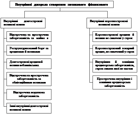 Рис. 1. Зовнішні джерела створення позикового фінансового капіталу підприємств. Друга група – внутрішні джерела позикових коштів, до яких входять позикові фінансові ресурси, що утворюються за рахунок відстрочених і прострочених зовнішніх довгострокових і короткострокових зобов’язань (рис. 2). При нормальній ринковій економіці обсяг таких позикових ресурсів не досить значний. Однак у перехідний період ці позикові кошти використовуються досить активно для формування довгострокового і короткострокового фінансового капіталу.