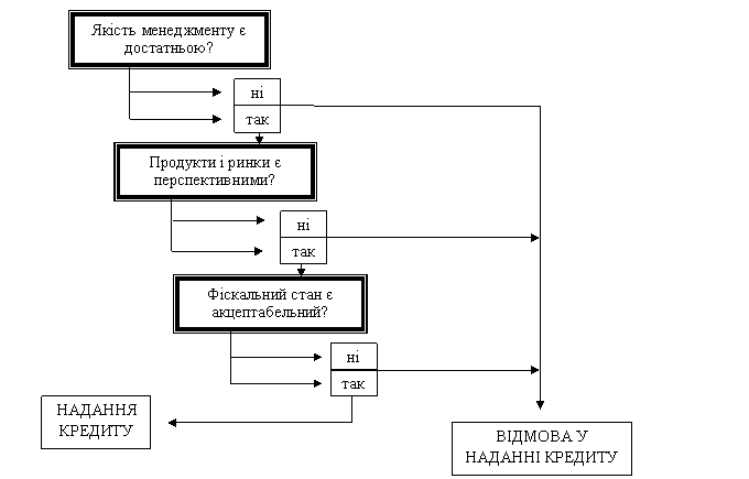 Рис. 1. Елементи оцінки кредитоспроможності у взаємозв’язку. У теорії і практиці немає єдності щодо пріоритетності того чи іншого елемента кредитоспроможності. Вважається, що якісні чинники досить важко оцінити і систематизувати: на це потрібно витратити більше часу і затрат, ніж на оцінку фінансового стану. Зазначені чинники досліджуються за двома напрямами: якість менеджменту та ситуація на ринку факторів виробництва і збуту продукції (товарів). При оцінці рівня менеджменту увага концентрується на персональних і фахових якостях керівництва, а також на організації управління підприємством. Відповідні висновки робляться на основі вивчення інформації, яка характеризує: · наявність і реальність довгострокової стратегії розвитку підприємства; · уміння керівника чітко формулювати стратегічні цілі та концепцію розвитку підприємства; · наявність та функціональну спроможність системи контролінгу; · освіту, досвід та імідж керівництва; · дотримання ділової етики, договірну та платіжну дисциплінну підприємства; · вміння менеджменту вчасно оцінювати підприємницькі ризики та вживати заходів щодо їх нейтралізації; · внутрішній клімат, який склався на підприємстві, та виробничу дисципліну; · рівень розмежування функціональних обов'язків працівників, наявність посадових інструкцій; · плинність кадрів на ключових посадах. Банківська практика свідчить, що в результаті суб'єктивних оцінок якість менеджменту систематично завищується . Оцінюючи ситуацію підприємства на ринку факторів виробництва та збуту продукції, використовують результати галузевого аналізу, співбесіди з клієнтами позичальника, а також повідомлення засобів масової інформації. Основна увага при цьому концентрується на з'ясуванні таких питань: · рівень відповідності якості товарів їх цінам і вимогам ринку; · конкурентоспроможність продукції (на внутрішньому та зовнішньому ринках), конкурентні переваги; · якість маркетингової політики та концепції збуту продукції; й величина ринкового сегмента, який належить підприємству; · управління товарним асортиментом (розробка нових видів продукції); · основні споживачі готової продукції та їх частка в загальному обсязі реалізації; · наявність замовлення на реалізацію продукції (робіт, послуг); · залежність виробничо-господарської діяльності підприємства від постачальників сировини і матеріалів; · рівень зносу основних засобів і необхідність їх оновлення й наявність ефективної системи логістики на підприємстві. Глибина оцінки якісних критеріїв кредитоспроможності значною мірою залежить від строку, на який видається кредит. З метою оцінки кількісних критеріїв проводиться аналіз поточного та перспективного фінансового стану підприємства. Головне завдання полягає у прогнозуванні майбутньої платоспроможності підприємства. Для цього аналізуються всі можливі фактори, які можуть вплинути на платоспроможність. На практиці використовуються різні моделі аналізу: дискримінантний та регресійний аналіз, комплексна оцінка на основі розрахунку окремих фінансових показників тощо. Розглянемо найтиповіший підхід до оцінки фінансового стану підприємств, який застосовується провідними європейськими банками. В основі цього підходу лежить розрахунок таких основних блоків показників: · ліквідності та платоспр