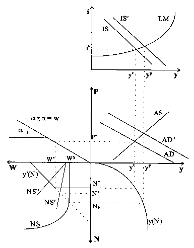 Рис. 3. Общее экономическое равновесие в кейнсианской модели Найденные значения эффективного спроса и занятости позволяют определить максимальную ставку заработной платы, которую готовы платить предприниматели при заданной технологии производства: WD = P(dy/dN), что отражено в третьем квадранте нижней части рис. 3. Если при заданном экзогенно предложении труда WD iWS то WD =W* , и на рынке труда устанавливается равновесие, следовательно, достигается равновесие на всех рынках. Как мы видим, общее равновесие в кейнсианской модели достигается, как правило, в условиях неполной занятости, существует безработица в размере NF – N* . Это объясняется тем, что спрос на труд зависит от величины эффективного спроса, а ставка номинальной зарплаты жестко фиксирована. При этом ставка реальной зарплаты, представленная во втором квадранте, может меняться под воздействием колебаний в уровне цен: рост цен вызывает смещение графика вверх и отражает уменьшение реальной зарплаты, снижение цен - соответственно, вниз и отражает рост реальной зарплаты. Как частный случай общее экономическое равновесие в кейнсианской модели может быть достигнуто и при полной занятости, но только при условии, что величина эффективного спроса достигнет уровня национального дохода полной занятости, однако равновесие вряд ли будет устойчивым, так как эффективный спрос зависит от параметров экономической конъюнктуры на двух рынках: благ и денег. Экономическая же система, по мнению кейнсианцев, не имеет встроенных стабилизаторов, которые могли бы обеспечить равновесие в условиях полной занятости. Поэтому для поддержания высокой занятости и уровня национального производства рекомендуется активное государственное вмешательство. Государство должно использовать имеющиеся в его распоряжении инструменты фискальной и монетарной политики, воздействуя на совокупный спрос. Так в условиях конъюнктуры, отображенной на рис. 3, государство вполне может довести занятость до полной №, используя, например, фискальные инструменты: L GÞIS®IS’ÞAD®AD’Þy®yf ÞN®Nf . При этом – на рынке труда равновесие сохранится, так как будет соблюдаться условий WD > WS . Но если бы кривая функции предложения труда сместилась в положение NS', то при сохранении равновесия на рынке труда занятость удалось бы довести только до N', так как при занятости больше N' не выполнялось бы условие: WD > WS . Тогда перед экономикой стояла бы дилемма: или равновесие на всех рынках, или полная занятость. В случае же сдвига кривой предложения труда в положение NS" равновесия на всех рынках достичь бы не удалось, так как равновесие на рынке труда возможно только при уровне занятости ниже N', то есть ниже уровня эффективной занятости. Общее равновесие в этом случае установится, но только после ряда корректировок равновесных параметров на других рынках. Предприниматели сократят спрос на труд, предложение благ уменьшится, соответственно должны измениться условия совместного равновесия и уровень цен, с тем, чтобы обеспечить новый равновесный уровень эффективного спроса. Однако в силу относительной жесткости цен и несовершенства рынков экономика самостоятельно далеко не всегда может обеспечить восстановление равновесия. Таким образом, экономика в кейнсианской модели представляется как внутренне нестабильная система, поэтому для поддержа