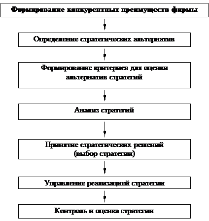 Рис.1.1. Процесс формирования конкурентных преимуществ фирмы. Другой отличительной характеристикой конкурентного преимущества, является его жизнеспособность и способность к развитию. Конкурентные преимущества не являются вечными ввиду двух причин: постоянной попытки отдельных конкурентов их имитировать, и в связи с турбулентностью внешней среды (изменение внешней среды ведет к изменению конкурентных преимуществ). Этот отличительный признак конкурентного преимущества лежит в основе ключевых компетенций компании, которые описывают способность фирмы к специализации или производству уникального продукта. Ими обозначается то, что организация умеет делать лучше своих конкурентов. Если компания знает, каковы ее отличительные способности, она может сфокусироваться на их использовании и развитии, не расходуя усилий в менее выгодных направлениях. Ключевые компетенции являются источником конкурентных преимуществ, и стратегия фирмы должна быть направлена на развитие данных источников. И успех конкурентной стратегии зависит не от единичного выбора ключевых факторов сегодняшнего дня, а является результатом культивирования подобных отличительных способностей организации на протяжении длительного периода времени. Основой стратегического потенциала компании является категория трудно имитируемых конкурентных преимуществ. Выделяют конкурентное преимущество, которое соперники могут скопировать и устойчивое конкурентное преимущество, недоступное для копирования конкурентами. Для организации предпочтительнее выделение категории трудно имитируемых конкурентных преимуществ, так как ввиду постоянного стремления конкурентов копировать отличительные особенности компании, ее сильные стороны не могут быть вечными и полностью быть недоступными конкурентам. Но для повышения конкурентоспособности компании необходимо формировать и развивать такие конкурентные преимущества предприятия, которые были бы если и не вечными, то могли бы быть скопированы конкурентами со значительными затратами времени и ресурсов, что, в свою очередь, давало бы организации возможность одновременно развивать иные отличительные компетенции взамен потенциально подлежащих имитации. В качестве подобных трудно имитируемых конкурентных преимуществ можно выделить организационную культуру фирмы; уникальные характеристики менеджмента предприятия, например, эффективную мотивационную политику, стиль руководства, четкую координацию и контроль деятельности, оптимально построенную организационную структуру и др.; отличительные особенности человеческих ресурсов организации (высокая квалификация и богатый практический опыт персонала, инициативность, неординарность мышления, умение принимать решения и нести за них ответственность в нестандартных ситуациях и т.д.); качество товара, производства, системы сбыта и сервиса и т.п. К ним также могут относиться более высокий уровень производительности производственного, технического, коммерческого персонала, управленческое мастерство, стратегическое мышление на различных уровнях управления, отражающееся в экономическом росте. Следует отметить, что если конкурентные преимущества организации защищены от имитации конкурентов, то они формируют «стратегический потенциал компании». Под «страте