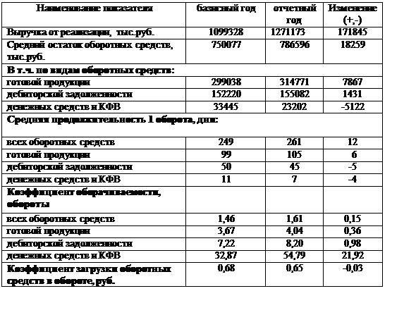 Абсолютное значение оборотных средств увеличивается на 18259 тыс. руб. По видам оборотных средств изменения следующие: произошло увеличение готовой продукции на 7867 тыс. руб., увеличение дебиторской задолженности на 1431 тыс. руб. и уменьшение денежных средств и КФВ на 5122тыс. руб. Продолжительность одного оборота оборотных средств увеличивается по всем показателям, кроме денежных средств и КФВ и дебиторской задолженности. Увеличение длительности одного оборота свидетельствует о неэффективном использования оборотных средств, а уменьшение длительности одного оборота дни свидетельствует о рациональном использовании денежных средств и КФВ. Сокращение данного времени — важнейшее направление финансового управления, ведущее к повышению эффективности использования оборотных средств и увеличению их отдачи. Коэффициент оборачиваемости в целом увеличился. Это говорит о правильном распределении оборотных средств. Анализ влияния факторов на коэффициенты оборачиваемости анализируется по модели: