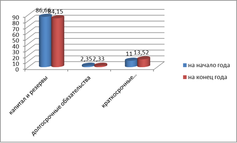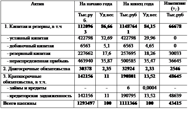 Рис .1 – анализ динамики и структуры активов В структуре активов большую долю имеют оборотные активы. Наибольшая часть оборотных активов представлена запасами и денежными средствами. В части внеоборотных активов, наибольшую долю имеют основные средства. Таблица10-Анализ динамики и структуры пассивов