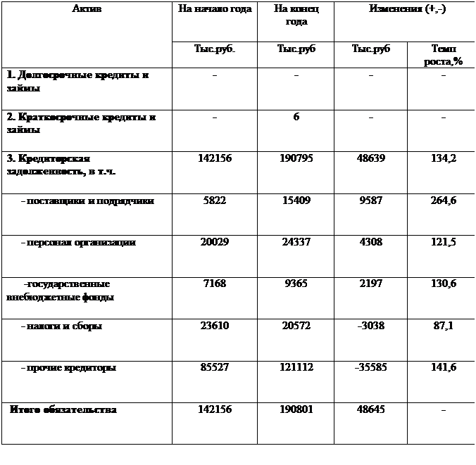 Из таблицы 11 видно, что произошло увеличение дебиторской задолженности на 7304тыс.руб. Увеличение дебиторской задолженности негативно сказывается на состоянии предприятия, оно приводит к уменьшению доходов. Таблица12-Анализ состояния и динамики займов и кредиторской задолженности Из таблицы 12 видно, увеличилась кредиторская задолженность на 48639 тыс.руб., что составляет 34,2%. Просроченная кредиторская задолженность отсутствует. Таблица13-Анализ чистых активов предприятия