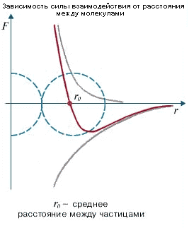 Силы взаимодействия между молекулами. На очень малых расстояниях между молекулами действуют силы отталкивания. Благодаря этому молекулы не проникают друг в друга и куски вещества никогда не сжимаются до размеров одной молекулы. Молекула - это сложная система, состоящая из отдельных заряженных частиц: электронов и атомных ядер. Хотя в целом молекулы электрически нейтральны, но между ними на малых расстояниях действуют значительные электрические силы: происходит взаимодействие электронов и атомных ядер соседних молекул. Если молекулы находятся на расстояниях, превышающих их размеры в несколько раз, то силы взаимодействия практически не сказываются. Силы между электрически нейтральными молекулами являются короткодействующими. На расстояниях, превышающих 2 - 3 диаметра молекул, действуют силы притяжения. По мере уменьшения расстояния между молекулами сила притяжения сначала увеличивается, а затем начинает убывать и убывает до нуля, когда расстояние между двумя молекулами становится равным сумме радиусов молекул. При дальнейшем уменьшении расстояния электронные оболочки атомов начинают перекрываться, и между молекулами возникают быстро нарастающие силы отталкивания.