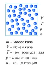 Идеальный газ. Основное уравнение МКТ. Известно, что частицы в газах, в отличие от жидкостей и твердых тел, располагаются друг относительно друга на расстояниях, существенно превышающих их собственные размеры. В этом случае взаимодействие между молекулами пренебрежимо мало и кинетическая энергия молекул много больше энергии межмолекулярного взаимодействия. Для выяснения наиболее общих свойств, присущих всем газам, используют упрощенную модель реальных газов - идеальный газ. Основные отличия идеального газа от реального газа: 1. Частицы идеального газа - сферические тела очень малых размеров, практически материальные точки. Реальные разреженные газы действительно ведут себя подобно идеальному газу. Воспользуемся моделью идеального газа для объяснения происхождения давления газа. Вследствие теплового движения, частицы газа время от времени ударяются о стенки сосуда. При каждом ударе молекулы действуют на стенку сосуда с некоторой силой. Складываясь друг с другом, силы ударов отдельных частиц образуют некоторую силу давления, постоянно действующую на стенку. Понятно, что чем больше частиц содержится в сосуде, тем чаще они будут ударяться о стенку сосуда, и тем большей будет сила давления, а значит и давление. Чем быстрее движутся частицы, тем сильнее они ударяют в стенку сосуда. Мысленно представим себе простейший опыт: катящийся мяч ударяется о стенку. Если мяч катится медленно, то он при ударе подействует на стенку с меньшей силой, чем если бы он двигался быстро. Чем больше масса частицы, тем больше сила удара. Чем быстрее движутся частицы, тем чаще они ударяются о стенки сосуда. Итак, сила, с которой молекулы действуют на стенку сосуда, прямо пропорциональна числу молекул, содержащихся в единице объема (это число называется концентрацией молекул и обозначается n), массе молекулы mo