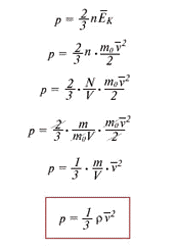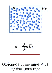 , среднему квадрату их скоростей и площади стенки сосуда. В результате получаем: давление газа прямо пропорционально концентрации частиц, массе частицы и квадрату скорости частицы (или их кинетической энергии). Зависимость давления идеального газа от концентрации и от средней кинетической энергии частиц выражается основным уравнением молекулярно-кинетической теории идеального газа. Мы получили основное уравнение МКТ идеального газа из общих соображений, но его можно строго вывести, опираясь на законы классической механики. Приведем одну из форм записи основного уравнения МКТ: