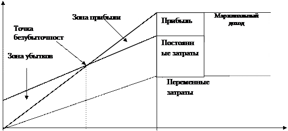 Социально-экономическое развитие России в период перехода к рыночным отношениям сопровождался качественными структурными сдвигами в сторону интенсификации производства. В этих условиях важным фактором дальнейшего развития любого предприятия является поток поступающих денежных средств, превышающих платежи. От наличия или отсутствия доходов будет зависеть в конечном счете возможность функционирования фирмы, ее конкурентоспособность и финансовое состояние. Основной источник доходов фирмы – выручка от реализации продукции, а именно та ее часть, которая остается за вычетом материальных, трудовых и денежных затрат на производство и реализацию продукции. По этому важная задача каждого хозяйствующего субъекта – получить больше прибыли при наименьших затратах путем соблюдения строгого режима экономии и расходования средств и наиболее эффективного их использования. А это в свою очередь зависит от успешного управления формированием прибыли. Прибыль от продаж (операционная прибыль, прибыль от реализации продукции) – финансовый итог деятельности предприятия и основная часть всей получаемой им массы прибыли. Управление формированием операционной прибыли – необходимый, но сложный и трудоемкий процесс, неразрывно связанный со всей деятельностью предприятия от приобретения сырья и выплат заработной платы до сдачи в аренду производственных помещений и работы с дебиторами. Как и в любом управлении, в управлении формированием прибыли от реализации продукции (работ, услуг) можно выделить следующие этапы: - учет; - анализ; - планирование. Представленным трем этапам сопутствует контроль: контроль соответствия и достоверности учитываемых данных, контроль качества анализа, контроль планирования реальных и достижимых показателей. Существует несколько способов планирования прибыли, на основе которых осуществляется управление формированием прибыли от продаж – метод прямого счета, аналитический метод и планирование на основе маржинального анализа. Цель данной курсовой работы: раскрыть теоретические и методические вопросы по анализу безубыточности продаж. Для достижения поставленной цели необходимо решить следующие задачи: 1) раскрыть сущность понятия «безубыточности продаж»; 2) описать различные методы анализа безубыточности; 3) определить роль и значение маржинального анализа для принятия управленческих решений; 4) проанализировать безубыточность продаж на примере конкретного российского предприятия. 1. Теоретические основы анализа 1.1 Сущность анализа безубыточности. Безубыточность – такое состояние, когда деятельность предприятия не приносит ни прибыли, ни убытков. Это выручка, которая необходима для того, чтобы предприятие начало получать прибыль. Ее можно выразить и в количестве единиц продукции, которую необходимо продать, чтобы покрыть затраты, после чего каждая дополнительная единица проданной продукции будет приносить прибыль предприятию (21, с. 13). Разность между фактическим количеством реализованной продукции и безубыточным объемом продаж – это зона безопасности (зона прибыли), и чем она больше, тем прочнее финансовое состояние предприятия (20, с. 68). Безубыточный объем продаж и зона безопасности предприятия являются основополагающими показателями при разработке бизнес-планов, обосновании управленч