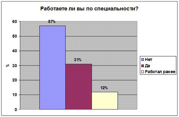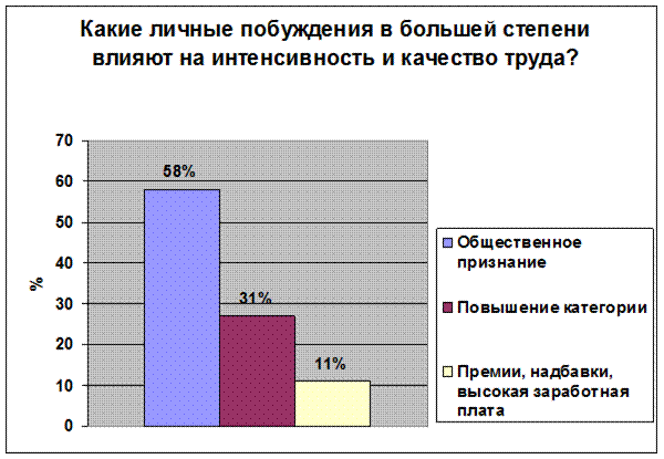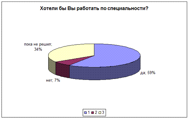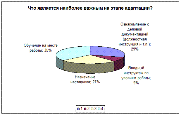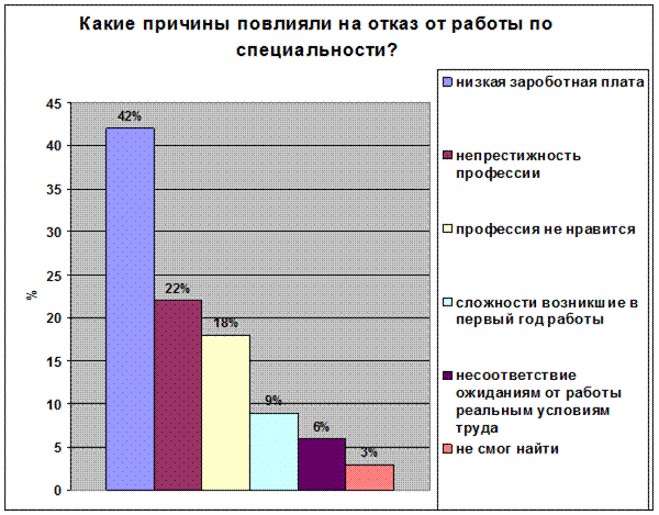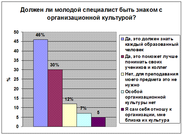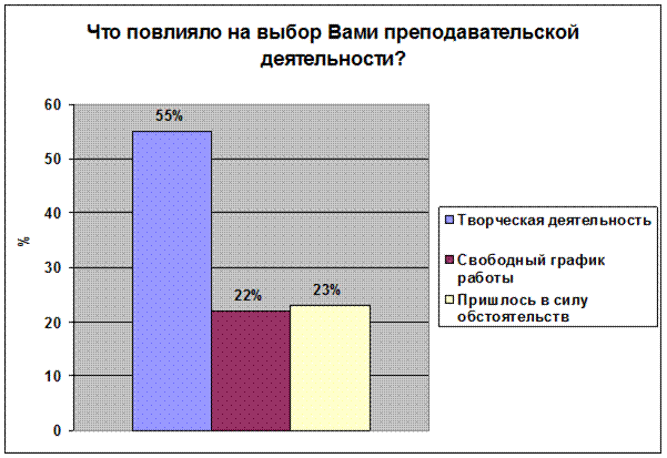 Рис.1.5 . Приложение №2 1. Работаете ли Вы по специальности: 1.да 2.нет 3.работал ранее 2. Какие причины повлияли на отказ от работы по специальности : 1. низкая заработная плата 2. профессия не нравится 3. не смог найти работу по специальности 4. непрестижность профессии 5. сложности, возникшие в первый год работы 6. несоответствие ожиданиям от работы реальным условиям труда 3.Должен ли молодой специалист быть знаком с организационной культурой: 1. да, это должен знать каждый образованный человек 2. да, это лучше поможет понимать своих учеников и коллег 3. нет, для моей педагогической деятельности это не нужно 4. особой организационной культуры нет 5. я сам себя отношу к организации, мне близка их культура 4. Какие взаимоотношения в Вашем коллективе: 1. отношения в основном хорошие - деловые 2. большинство хочет работать по-новому (творчески) 3. между коллегами разного стажа и возраста есть взаимопонимание 4. коллектив разбит на группы 5. превалируют споры, разногласия и непонимания 5.Статус педагога приобрести легко, а внутренне принятие социальной роли педагога затягивается на годы: 1. согласны 2. не согласны 3. не могу дать определенного ответа 6. Какие личные побуждения в большей степени влияют на интенсивность и качество труда: 1. общественное признание 2. повышение категории/повышении по службе 3. премии, надбавки, заработная плата 7. Что повлияло на выбор Вами преподавательской деятельности: 1. творческая работа 2. свободный график работы 3. пришлось в силу обстоятельств 8 . Как Вы оцениваете отношение к Вам в новом коллективе: Отношение опытных и старших коллег: Отношение администрации: 1.положительное 1. положительное 2.отрицательное 2. отрицательное 9 . Прислушиваются ли к Вашему мнению при обсуждении вопросов в жизни коллектива : 1. прислушиваются 2. не очень 3. не прислушиваются 10. Как работают с молодыми специалистами педагоги-наставники: 1. очень внимательны ко всем проблемам 2. уделяют внимание только при решении педагогических вопросов 3. не уделяют особого внимания молодым специалистам 11. Испытывали ли Вы в процессе адаптации стресс: 1. конечно, и очень часто 2. испытываю, но редко 3. не испытываю 12. Какие психологические и эмоциональные реакции возникают у Вас в стрессовых ситуациях: 1. депрессия 2. возмущение и агрессия 3. чувство беспокойства 4. крушение надежд 5. одиночество 13. Какие из личных причин могут в большей мере повлиять на возникновение стрессовых реакций: 1. 1.Болезнь \телесное повреждение 2. 2.Смерть супруга 3. 4.Развод 4. 5.Сексуальные заболевания Приложение №2.1.