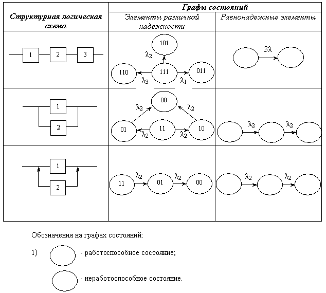 Для марковского процесса «будущее» зависит от «прошлого» только через «настоящее», т. е. будущее протекание процесса зависит только от тех прошедших событий, которые повлияли на состояние процесса в настоящий момент. Марковский процесс, как процесс без последействия, не означает полной независимости от прошлого, поскольку оно проявляется в настоящем. При использовании метода, в общем случае, для системы S , необходимо иметь математическую модель в виде множества состояний системы S 1 , S 2 , … , S n , в которых она может находиться при отказах и восстановлениях элементов. Для рассмотрения принципа составления модели введены допущения: - отказавшие элементы системы (или сам рассматриваемый объект) немедленно восстанавливаются (начало восстановления совпадает с моментом отказа); - отсутствуют ограничения на число восстановлений; - если все потоки событий, переводящих систему (объект) из состояния в состояние, являются пуассоновскими (простейшими), то случайный процесс переходов будет марковским процессом с непрерывным временем и дискретными состояниями S 1 , S 2 , … , S n . Основные правила составления модели: 1. Математическую модель изображают в виде графа состояний. Элементы графа: а) кружки (вершины графа S 1 , S 2 , … , S n ) – возможные состояния системы S , возникающие при отказах элементов; б) стрелки – возможные направления переходов из одного состояния Si в другое Sj . Над/под стрелками указываются интенсивности переходов. Примеры графа: