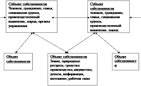 ВВЕДЕНИЕСобственность – это основа любого общественного строя и общества. «Собственность» происходит от слов «собъ» -имущество, пожитки и «Собность» - владение вещью как личным достоянием. Общество не может существовать там, где нет никакой формы собственности, поскольку основой любой социально-экономической системы является собственность на ресурсы (экономические ресурсы) и результаты труда (экономические блага). Понять сущность собственности можно, если рассмотреть ее во взаимосвязи со всеми другими экономическими отношениями общества: производством, распределением, обменом и потреблением благ. Именно собственность наиболее полно отражает социально-экономический характер эпохи. Понятие собственности имеет юридический (правовой) и экономический аспекты. В данной работе я рассмотрю оба вышестоящих аспекта. 1.СОБСТВЕННОСТЬ: ЮРИДИЧЕСКИЙ АСПЕКТ.Собственность в юридическом смысле выражает имущественные отношения, обусловленные законом. Это комплекс прав, а именно: - право владения; - право пользования; - право распоряжения . «Статья 209. Содержание права собственности. 1. Собственнику принадлежат права владения, пользования и распоряжения своим имуществом. 2. Собственник вправе по своему усмотрению совершать в отношении принадлежащего ему имущества любые действия, не противоречащие закону и иным правовым актам и не нарушающие права и охраняемые законом интересы других лиц, в том числе отчуждать свое имущество в собственность другим лицам, передавать им, оставаясь собственником, права владения, пользования и распоряжения имуществом, отдавать имущество в залог и обременять его другими способами, распоряжаться им иным образом.»[1] Право всегда влечет за собой ответственность. В реальной жизни мы чаще всего мы встречаемся именно с юридическим определением собственности как имущественного права. Это закреплено в законах (Конституции России, Гражданском Кодексе российской Федерации, законе “О собственности” и др.) Существует более детальная характеристика правовых норм собственности в условиях рыночной экономики. Рассмотрим некоторые из этих прав более подробно. 1. Право владения возникает в результате купли, дарения, наследования, создания собственным трудом, изобретения, если им удается придать законную форму. Во всех случаях право владения должно подкрепляться соответствующими документами: купчей, документом о дарении, завещанием, свидетельством – государственной регистрации, патентом, приватизационным ваучером. 2. Право пользования это возможность использования данной собственности по ее назначению. Например; земли сельскохозяйственного назначения используются для обработки и выращивания продукции сельского хозяйства, В строительстве земля используется под гражданские и промышленные постройки и.т.д. Если собственность представляет собой капитал, то он может использоваться в качестве инвестиций в производство; для предоставления кредитов через банки для финансовых операций на фондовой бирже и т.д. 3. Право пользования собственностью владелец может передать другому лицу, предоставив свою собственность в аренду. В этом случае право пользования переходит к арендатору за определенную плату и на оговоренный срок. Теперь арендатор решает, как использовать эту собственность. Если это пахотные земли, аре