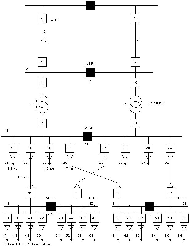 Рисунок 3 – Схема замещения для определения параметра потока аварийных отключений узла нагрузки Для нахождения параметров Используя рис. 4, построим схему минимальных сечений рис. 5, учитывающую отказы в срабатывании коммутационных аппаратов при КЗ в зоне действия их защит. Так, например, при КЗ в линии 3 (точка К1) она отключится коммутационным аппаратом 1. Отключение линейного выключателя 5 на стороне 35 кВ осуществляется защитой минимального напряжения. Включение АВР на секционном выключателе 7 должно произойти только после неуспешного однократного автоматического повторного включения линии (АПВ) 35 кВ на коммутационном аппарате 1. При этом, для восстановления питания с помощью АПВ (при устранившемся КЗ) потребуется включение только одного выключателя и электроснабжение потребителей будет происходить по нормальной схеме. В случае не устранившегося КЗ на линии 3, для работы АВР секционного выключателя 35 кВ (выключатель 7) потребуется отключить линейный выключатель 5 и включить секционный выключатель 7. Питание потребителей будет осуществляться по одной линии 35 кВ. Если произошел отказ или неуспешное включение секционного выключателя 35 кВ, то питание потребителей может быть восстановлено только включением секционного выключателя 10 кВ – выключатель 15. Если защиту минимального напряжения АВР 10 кВ (АВР2, рис.3) не согласовать по времени с АВР 35 кВ, то она отключит выключатель 13 раньше, чем включится секционный выключатель 35 кВ от своего АВР. Питание потребителей будет осуществляться только от одного трансформатора. Это менее надежная схема и оставшийся в работе трансформатор может перегрузиться, что при исправном втором трансформаторе нежелательно. Аналогично, защита минимального напряжения на распределительных пунктах РП1 и РП2 должна срабатывать только после неуспешного АПВ линии 10 кВ. Кроме того, время срабатывания этой защиты целесообразно принять больше времени действия АВР2 10 кВ. При согласовании выдержки времени защиты минимального напряжения с вышестоящим АВР, также имеющем пуск от своей защиты минимального напряжения, необходимо обеспечить, чтобы рассматриваемая защита не успела сработать до подачи напряжения в результате успешного действия вышестоящего устройства АВР, запущенного своей защитой минимального напряжения. Используя схему замещения минимальных сечений рис. 5, исходные данные примера, формулы (15), (16) определим параметр потока аварийных отключений узла нагрузки для потребителей, получающих электроэнергию от секции I РП 1 следующим образом: