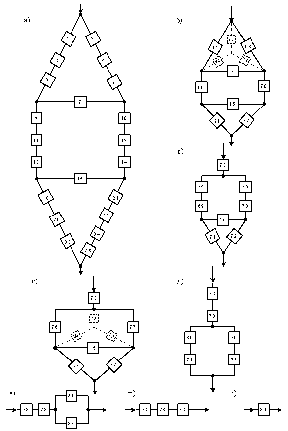 Последовательно соединенные элементы 80, 71 и 79, 72 заменим эквивалентными: 82 и 81 (рис. 3 д).