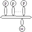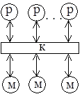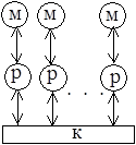 Классификация параллельных вычислительных систем, предложенная Т.Джоном, основана на разделении МВС по двум критериям: способу построения памяти (общая или распределенная) и способу передачи информации. Основные типы машин по классификации Т.Джона представлены в таблице 2.6. Здесь приняты следующие обозначения: p - элементарный процессор, M - элемент памяти, K - коммутатор, С - кэш-память. Параллельная вычислительная система с общей памятью и шинной организацией обмена (машина 1) позволяет каждому процессору системы видеть", как решается задача в целом, а не только те части, над