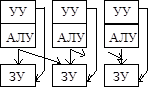 Таблица 2.6 – Классификация МВС по типам памяти и передачи сообщений которыми он работает. Общая шина, связанная с памятью, вызывает серьезные проблемы для обеспечения высокой пропускной способности каналов обмена. Одним из способов обойти эту ситуацию является использование кэш-памяти (машина 2). В этом случае возникает проблема когерентности содержимого кэш-памяти и основной. Другим способом повышения производительности систем является отказ от центральной памяти (машина 3). Идеальной машиной является вычислительная система, у которой каждый процессор имеет прямые каналы связи с другими процессорами, но в этом случае требуется чрезвычайно большой объем оборудования для организации межпроцессорных обменов. Определенный компромисс представляет сеть с фиксированной топологией, в которой каждый процессор соединен с некоторым подмножеством процессоров системы. Если процессорам, не имеющим непосредственного канала обмена, необходимо взаимодействовать, они передают сообщения через промежуточные процессоры. Одно из преимуществ такого подхода - не ограничивается рост числа процессоров в системе. Недостаток - требуется оптимизация прикладных программ, чтобы обеспечить выполнение параллельных процессов, для которых необходимо активное воздействие на соседние процессоры. Наиболее интересным вариантом для перспективных параллельных вычислительных комплексов является сочетание достоинства архитектур с распределенной памятью и каналами межпроцессорного обмена. Один из возможных методов построения таких комбинированных архитектур - конфигурация с коммутацией, когда процессор имеет локальную память, а соединяются процессоры между собой с помощью коммутатора (машина 9). Коммутатор может оказаться весьма полезным для группы процессоров с распределяемой памятью (машина 8). Данная конфигурация похожа на машину с общей памятью (машина 7), но здесь исключены проблемы пропускной способности шины. Недостатками классификации Т.Джона является скрытие уровня параллелизма в системе. Параллелизм любого рода требует одновременной работы, по крайней мере, двух устройств. Такими устройствами могут быть: арифметико-логические устройства (АЛУ), устройства управления (УУ). В ЭВМ классической архитектуры УУ и АЛУ образуют процессор. Увеличение числа процессоров или числа АЛУ в каждом из них приводит к соответствующему росту параллелизма. Наличие в ЭВМ нескольких процессоров означает, что одновременно (параллельно) могут выполняться несколько программ или несколько фрагментов одной программы. Работа нескольких АЛУ под управлением одного УУ означает, что множество данных может обрабатываться параллельно по одной программе. В соответствии с этим описание структур параллельных систем можно представить в виде упорядоченной тройки: <k,d,w>, где k - количество устройств управления, т.е. наибольшее количество независимо и одновременно выполняемых программ в системе; d - количество АЛУ, приходящихся на одно устройство управления; w - количество разрядов, содержимое которых обрабатывается одновременно (параллельно) одним арифметико-логическим устройством. Другая форма распараллеливания - конвейеризация, также требует наличия нескольких ЦП или АЛУ. В то время, как множество данных обрабатывается на одном устройстве, другое множество д