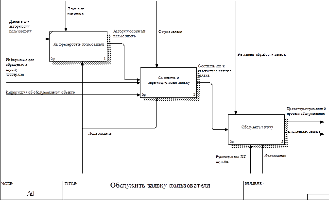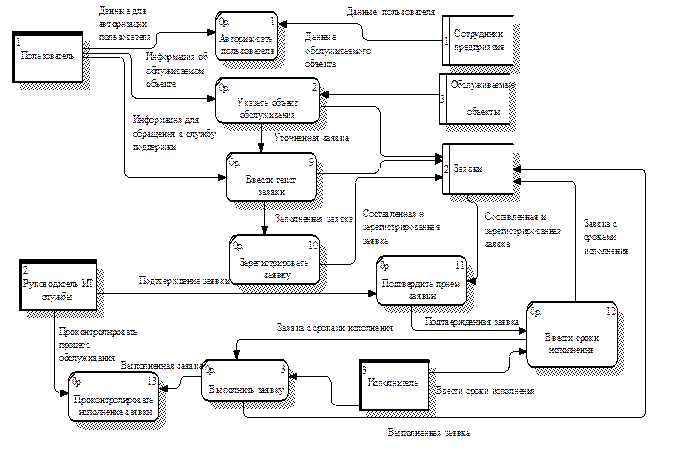 Рисунок 4 - Декомпозиция процесса обработки и обслуживания заявки 1.2.2 Диаграмма потоков данных (DFD) В отличие от стрелок в IDEF0, которые иллюстрируют отношения, стрелки в DFD показывают, как объекты (включая и данные) реально перемещаются от одного действия к другому. Это представление потока обеспечивает отражение в DFD-моделях таких физических характеристик системы, как движение объектов (потоки данных), хранение объектов (хранилища данных), источники и потребители объектов (внешние сущности). На рисунке 4 представлена технология обработки данных и передачи информации от одной функции к другой в виде диаграммы потоков данных (DFD-диаграммы). Перед построением диаграммы потоков данных проанализированы входные и выходные данные системы, оказывающие влияние на ее функционирование. Входными данными для системы являются: данные для авторизации пользователя, информация для обращения в службу поддержки пользователей, информация об обслуживаемом объекте. Выходными данными для системы является вся выполненная заявка, проконтролированный процесс исполнения заявки.