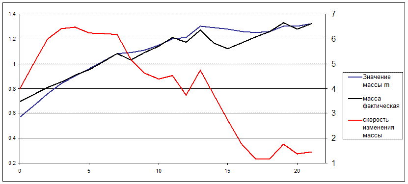 Рисунок 6 – Результаты расчетов содержания кремния Si, %, в стали 2.4 Оценка и контроль масс дозируемых материаловВысокая точность взвешивания дозируемых материалов необходима для наиболее рационального их расхода и более точного соблюдения технологических операций. Это влияет на качество и себестоимость готовой продукции. Кривые, получаемые при взвешивании и дозировании материалов, имеют сходство с кривыми измерения температуры в плане наличия локально-стационарного участка типа "полочки". Поэтому было произведено исследования алгоритма, работа которого основана на действии робастного фильтра, применительно к весовым кривым изменения сигнала. Исследование проводилось путем сравнения предлагаемого алгоритма с более простым - алгоритмом текущего среднего. Выбор алгоритмов РЭС в качестве базовой процедуры оценивания объясняется следующими причинами: - достигается эффективное совмещение операций обнаружения и отбраковки выбросов (как операций проверки и повышения достоверности) с операциями собственно сглаживания, то есть выделения медленно меняющегося полезного сигнала и фильтрации, соответственно, высокочастотной составляющей измерительных помех; - настроечные коэффициенты РЭС сравнительно просто связать с содержательными технологическими характеристиками процессов и параметрами контролируемых сигналов; тем самым методики настройки РЭС удачно вписываются в концепцию описания желаемых свойств полезного сигнала по целевым (общесистемным) критериям и ограничениям, а результаты их применения оказываются хорошо интерпретируемыми; Результаты обработки весовых кривых с использованием алгоритма текущего среднего представлены в таблице 5 и показаны графически на рисунке 7. Результаты обработки при помощи алгоритма робастной фильтрации сведены в таблицу 6 и показаны на рисунке8. Сравнивая полученные при обработки кривых результаты видно, что использование сложного алгоритма позволяет более точно определять массу дозируемых материалов. Точность определения массы достигается за счет более точной и надежной обработки данных и выделений на весовых кривых локально-стационарного участка, по которому можно судить о действительной величине массы с достаточной объективностью. Следовательно, при сравнении рассмотренных алгоритмов предпочтение следует отдавать более сложному и более надежному. Таблица 4 – Весовая кривая измерения в цифровом виде