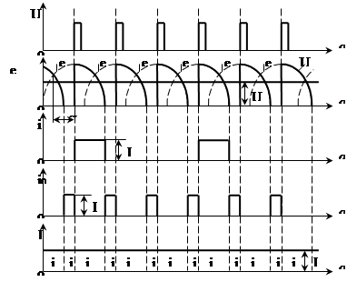 Рис.1 Основные особенности импульсного метода регулирования Регулирование напряжения потребителя посредством импульсных преобразователей (ИП) называют импульсным регулированием. С помощью импульсного преобразователя источник постоянного или переменного напряжения периодически подключается к нагрузке. Преобразователи, позволяющие осуществлять широтно-импульсное регулирование напряжения на нагрузке, называют широтно-импульсными преобразователями (ШИП). ШИП находят широкое применение для регулирования и стабилизации напряжения различных потребителей (электротранспорт, электропривод металлообрабатывающих станков, в бортовых системах и т.д.), что объясняется рядом их преимуществ: высокий к.п.д., так как потери мощности на регулирующем элементе преобразователя незначительны по сравнению с потерями мощности в случае непрерывного регулирования; малая чувствительность к изменениям температуры окружающей среды, поскольку регулирующим фактором является время проводимости ключа, а не величина внутреннего сопротивления регулирующего элемента, что имеет место при непрерывном регулировании; малые габариты и масса; постоянная готовность к работе. Вместе с тем широтно-импульсным преобразователям присущи и недостатки: импульсный режим работы регулирующего элемента приводит к необходимости устанавливать выходные фильтры, что вызывает инерционность процесса регулирования в замкнутых системах; высокие скорости включения и выключения тока в силовой цепи ШИП приводит к возникновению радиопомех. Несмотря на указанные недостатки, применение импульсных преобразователей перспективно в тех случаях, когда на первое место выдвигаются требования высокой экономичности, надежности, малых габаритов, малой чувствительности к колебаниям температуры, высокой гибкости и точности регулирования. Выходные каскады ШИП наиболее просто выполнять на полностью управляемых вентилях — транзисторах и двухоперационных тиристорах, отпирание и запирание которых производится по базовым цепям. Описание работы схемы. Электрические параметры определяются в общем виде для многофазного выпрямителя с числом пульсаций выпрямленного напряжения за период При активно-индуктивной нагрузке ( При учете индуктивностей рассеяния обмоток трансформатора