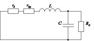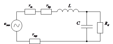 4. Расчет устойчивости системы в "малом" для установившегося режима Принимаем следующие допущения: в открытом состоянии диод и тиристоры заменяются активными сопротивлениями, в закрытом — сопротивление этих ключей бесконечно большое (т.е. цепь разомкнута), индуктивность дросселя постоянна и не зависит от протекающего через него тока, емкость конденсатора не зависит от приложенного к нему напряжения. Эквивалентная схема управляемого выпрямителя показана на рис. 5, где