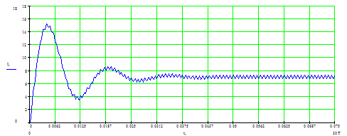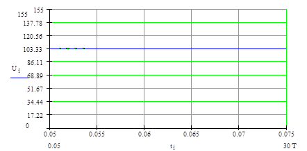 Как видим, процесс стал полностью периодичен 35 такта, то есть получаем установившийся режим за 0.0291с. С учетом ОС, идет стабилизация выходного напряжения. Стабилизированное напряжение при номинальном угле регулирования. Получаем формы напряжения на емкости и тока в индуктивности: