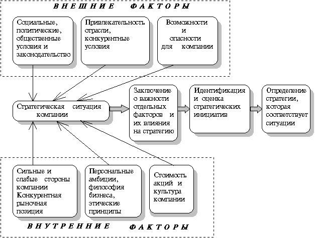 Рис.2. Процесс стратегического менеджмента 3.5 Факторы, определяющие стратегию компании Этих факторов очень много. Простая модель первичных факторов, которые должны учитываться и по существу определять стратегию, приведена на рис.7. Взаимодействие этих факторов обычно комплексное и имеет специфические отличия для отрасли и компании. Как правило, стратегия не обеспечивает успеха, если не проведена граница между внутренней и внешней ситуацией, не обеспечено приобретение существенных конкурентных преимуществ и не улучшена деятельность компании.