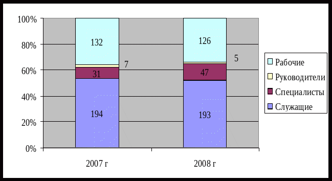 На 01.01.2008 год списочная численность Общества составляла 371 человек. На 01.01.2009 год –364 человека. В 2007 году выбыло 39 человек, в 2008 году- 44 человека. Причины увольнения в 2008 году следующие: прекращение трудовых отношений по собственному желанию работника- 41 (в том числе на пенсию- 5), за отсутствие на рабочем месте- 1, окончание срока трудового договора- 1, в связи со смертью работника- 1. Таблица 5 Категории работающих в ООО «СДН ТрансАвто» за период 2007-2008 гг.