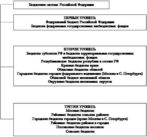 Схема построения бюджетной системы приведена на рис.1. Рис.1 Схема бюджетной системы Российской Федерации Бюджетная система РФ состоит из бюджетов трех уровней: первый уровень – федеральный бюджет и бюджеты государственных внебюджетных фондов; второй уровень – бюджеты субъектов Российской Федерации и бюджеты территориальных государственных внебюджетных фондов; третий уровень – местные, в том числе: бюджеты муниципальных районов, бюджеты городских округов, бюджеты внутригородских муниципальных образований городов федерального значения Москвы и Санкт-Петербурга; бюджеты городских и сельских поселений . Бюджеты субъектов РФ включают: 21 бюджет республик в составе РФ; 6 бюджетов краев; 49 бюджетов областей; 1 бюджет автономной области; 10 бюджетов автономных округов; бюджеты Москвы и Санкт-Петербурга. Бюджеты органов местного самоуправления РФ включают: 1867 бюджетов районов; 1091 бюджет городов; 329 бюджетов городских районов и округов; 1922 бюджета поселков городского типа; 24 444 бюджета сельских администраций. Каждый уровень включает в себя самостоятельные звенья бюджетной системы РФ. Бюджеты, действующие на соответствующих территориях, объединяются в консолидированные бюджеты. В законодательстве они представлены по уровням их формирования. Консолидированный бюджет – свод бюджетов бюджетной системы РФ на соответствующей территории (за исключением бюджетов государственных внебюджетных фондов) без учета межбюджетных трансфертов между этими бюджетами. Федеральный бюджет и консолидированные бюджеты субъектов РФ составляют консолидированный бюджет РФ. Консолидированные бюджеты не утверждаются законодательными органами. Это статистический свод бюджетных показателей, которые характеризуют доходы и расходы (источники поступлений средств и направления их использования по территориям в целом и по отдельным субъектам РФ). Консолидированные бюджеты используются: во-первых, в бюджетном планировании (нормативы отчислений в нижестоящие бюджеты); во-вторых, при анализе формирования и использования централизованного финансового фонда страны; в-третьих, при расчетах, характеризующих различные виды обеспеченности жителей страны, территорий. В свою очередь среднебюджетные показатели являются критериями для сравнительного анализа состояния отдельных территорий. Все субъекты Федерации и соответствующие местные органы власти на основе федерального законодательства самостоятельно осуществляют бюджетный процесс, исходя из государственного и административно-территориального устройства своей территории. Таким образом, бюджетная система, основанная на экономических отношениях и юридических нормах совокупность всех видов бюджетов в стране, имеющих между собой установленные законом взаимоотношения. Бюджетные системы разных стран отличаются своей структурой, количеством отдельных видов бюджетов. Наблюдается значительная зависимость бюджетной системы от государственного устройства и территориального деления. Российская Федерация – федеративное государство, имеющее три уровня бюджета. Единство бюджетной системы основано на взаимодействии бюджетов всех уровней, осуществляемом через использование регулирующих доходных источников, создание целевых и региональных бюджетных фондов, их частичного перераспределен