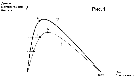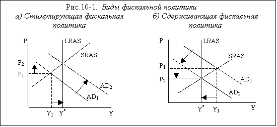 Стимулирующая фискальная политика применяется при спаде (рис. 10.1(а)), имеет целью сокращение рецессионного разрыва выпуска и снижение уровня безработицы и направлена на увеличение совокупного спроса (совокупных расходов). Ее инструментами выступают: а) увеличение государственных закупок; б) снижение налогов; в) увеличение трансфертов. Сдерживающаая фискальная политика используется при буме (при пере- греве экономики) (рис.10.1.(б)), имеет целью сокращение инфляционного разрыва выпуска и снижение инфляции и направлена на сокращение совокупного спроса (совокупных расходов). Ее инструментами являются: а) сокращение государственных закупок; б) увеличение налогов; в) сокращение трансфертов. Кроме того, различают фискальную политику : 1) дискреционную и 2) автоматическую (недискреционную). Дискреционная фискальная политика представляет собой законодательное (официальное) изменение правительством величины государственных закупок, налогов и трансфертов с целью стабилизации экономики Автоматическая фискальная политика связана с действием встроенных (автоматических) стабилизаторов. Встроенные (или автоматические) стабилизаторы представляют собой инструменты, величина которых не меняется, но само наличие которых (встроенность их в экономическую систему) автоматически стабилизирует экономику, стимулируя деловую активность при спаде и сдерживая ее при перегреве. К автоматическим стабилизаторам относятся: 1) подоходный налог (включающий в себя и налог на доходы домохозяйств, и налог на прибыль корпораций); 2) косвенные налоги (в первую очередь, налог на добавленную стоимость); 3) пособия по безработице; 4) пособия по бедности. Рассмотрим механизм воздействия встроенных стабилизаторов на экономику. Подоходный налог действует следующим образом: при спаде уровень деловой активности (Y) сокращается, а поскольку налоговая функция имеет вид: Т = tY (где Т - величина налоговых поступлений, t - ставка налога, а Y - величина совокупного дохода (выпуска)), то величина налоговых поступлений уменьшается, а при "перегреве" экономики, когда величина фактического выпуска максимальна, налоговые поступления увеличиваются. Заметим, что ставка налога остается неизменной. Однако налоги - это изъятия из экономики, сокращающие поток расходов и, следовательно, доходов (вспомним модель кругооборота). Получается, что при спаде изъятия минимальны, а при перегреве максимальны. Таким образом, из-за наличия налогов (даже аккордных, т.е. автономных) экономика как бы автоматически "остужается" при перегреве и "подогревается" при рецессии. Как было показано в главе 9, появление в экономике подоходных налогов уменьшает величину мультипликатора (мультипликатор при отсутствии ставки подоходного налога больше, чем при ее наличии: [1/(1- mpc)] > [1/(1- mpc(1- t)]), что усиливает стабилизационный эффект воздействия на экономику подоходного налога. Очевидно, что наиболее сильное стабилизирующее воздействие на экономику оказывает прогрессивный подоходный налог. Налог на добавленную стоимость (НДС) обеспечивает встроенную стабильность следующим образом. При рецессии объем продаж сокращается, а поскольку НДС является косвенным налогом, частью цены товара, то при падении объема продаж налоговые поступления от косвенных налогов (изъятия из экономики) сокращаются. При перегреве, наоборот