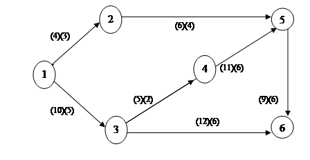 Полный путь– это путь от исходного до завершающего события или любой путь от истока к стоку. Критический путь - максимальный по продолжительности полный путь в сети называется критическим; работы, лежащие на этом пути, также называются критическими. Именно длительность критического пути определяет наименьшую общую продолжительность работ по проекту в целом. Длительность выполнения всего проекта в целом может быть сокращена за счет сокращения длительности задач, лежащих на критическом пути. Соответственно, любая задержка выполнения задач критического пути повлечет увеличение длительности проекта. Концепция критического пути обеспечивает концентрацию внимания менеджера на критических работах. Однако основным достоинством метода критического пути является возможность манипулирования сроками выполнения задач, не лежащих на критическом пути. Расчет полных путей: При нормальном режиме 1) 1 – 2 – 5 - 6 => 4 + 6 + 9 = 19 2) 1 – 3 - 6 => 10 + 12 = 22 3) 1 – 3 – 4 – 5 - 6 => 10 + 5 + 11 + 9 = 35 При ускоренном режиме 1) 1 – 2 – 5 - 6 => 3 + 4 + 6 = 13 2) 1 – 3 - 6 => 5 + 6 = 11 3) 1 – 3 – 4 – 5 - 6 => 5 + 2 + 6 + 6 = 19 Таким образом, критические пути при нормальном режиме число 35, при ускоренном число 19.