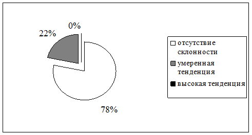 Рисунок 3 – Склонность к аддиктивному поведению Из рисунка видно, что для подростков данной выборки не характерна склонность к реализации аддиктивного поведения и только 22% опрошенных подростков имеют предрасположенность к уходу от реальности посредством изменения своего психического состояния, склонности к иллюзорно-компенсаторному способу решения личностных проблем.