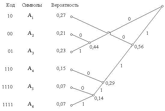 Рис.2.5. A3 , A4 , A5 , A6 и приведены вероятности, с которыми они появляются. Построение кодовой таблицы начинается с того, что два символа с наименьшими вероятностями объединяются в узел кодового дерева, которому приписывается их суммарная вероятность. Речь идет о символах A5 и A6 , суммарная вероятность которых равна 0,14. Далее объединяются следующие символы или узлы с наименьшей вероятностью, как это показано на рисунке. Этот процесс продолжается до тех пор, пока ветви кодового дерева не сойдутся к одному узлу, расположенному в вершине. После этого ветви дерева в зависимости от того, в какую сторону они расходятся от узла, обозначаются нулями или единицами (на рис. 2.5 правые ветви обозначены нулями, а левые единицами). Для того, чтобы найти значение кодового слова, которое следует приписать каждому символу, необходимо идти от вершины кодового дерева к данному символу, записывая нули или единицы, которыми обозначены пройденные ветви. В случае применения кода Хаффмена для сжатия изображений необходимо вначале осуществить декорреляцию сигнала, которым представлено изображение, например, используя для этой цели метод кодирования длин серий, а уже затем применять кодирование по Хаффмену. 8 ПРИНЦИПЫ КОДИРОВАНИЯ С ИСПОЛЬЗОВАНИЕМ ОРТОГОНАЛЬНЫХПРЕОБРАЗОВАНИЙ Особенностью данного метода сжатия изображений является то, что при этом методе кодируется не само изображение, а значения спектральных коэффициентов, получающихся при ортогональном преобразовании изображения. В результате ортогональных преобразований изображения Существуют два метода отбора спектральных коэффициентов: зональный и пороговый. Первый метод заключается в том, что заранее, исходя из статистики изображений, в матрице спектральных коэффициентов выделяются зоны и все спектральные коэффициенты, входящие в одну зону, квантуются на одно и то же число уровней, как это показано на рис. 3.1.