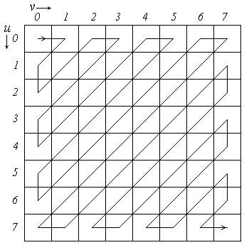 Рис. 4.1. зигзаг-сканирования считываются спектральные коэффициенты с большими амплитудами, а в конце - спектральные коэффициенты, величина которых мала или равна нулю, получающаяся в результате этого сканирования последовательность чисел будет в конце содержать длинные последовательности нулей. Эта особенность используется для дальнейшего сжатия данных путем энтропийного кодирования, которое состоит в последовательном применении метода кодирования длин серий и кода Хаффмена. Из ряда спектральных коэффициентов образуются пары чисел, одно из которых равно значению ненулевого спектрального коэффициента, а другое - количеству предшествующих этому спектральному коэффициенту нулей. Полученные таким образом пары сжимаются посредством применения кода Хаффмена с фиксированной таблицей. В этой таблице наиболее вероятным значениям полученных чисел, которые соответствуют малым последовательностям нулей и малым значениям ненулевых спектральных коэффициентов ставятся в соответствие короткие коды. Поскольку код Хаффмена является префиксным, то в данном случае не требуется разделителей между кодовыми словами. Алгоритм декодирования повторяет все перечисленные операции, но в обратном порядке. Достоинством описанного метода является высокий коэффициент сжатия, который для цветных изображений при хорошем качестве их восстановления может достигать 6 – 10. Величина коэффициента сжатия изображений при их записи в файл может регулироваться посредством специальной опции, которая соответствующим образом изменяет коэффициенты матрицы квантования ВыводМультимедиа технологии – это совокупность программно-аппаратных средств, реализующих обработку информации в звуковом и зрительном виде. Каждый из нас не раз слышал, что "компьютер может все". Однако, в реальной жизни мы не имели убедительных подтверждений подобных высказываний прежде всего потому, что имелись в виду потенциальные возможности компьютера, известные, в основном, узкому кругу специалистов. Ситуация существенно изменилась с появлением мультимедиа технологий, позволяющих раскрыть этот потенциал в привычной информационной среде. Графика, анимация, фото, видео, звук, текст в интерактивном режиме работы создают интегрированную информационную среду, в которой пользователь обретает качественно новые возможности. Самое широкое применение мультимедиа технологии нашли в образовании - от детского до пожилого возраста и от вузовских аудиторий до домашних условий. Мультимедиа продукты успешно используются в различных информационных, демонстрационных и рекламных целях, внедрение мультимедиа в телекоммуникации стимулировало бурный рост новых применений. В данной работе, на основе методическо - информационных материалов были рассмотрены возможности ММТ в области обработки изображений, по средствам которых можно, к примеру, обработать фотографии, «качественно» передать информацию от пользователя к пользователю, компактно хранить информацию на жестких дисках ПК, создавать постеры или работать с иллюстрациями – любые преобразования с изображениями хоть в профессиональной сфере, хоть на бытовом уровне. СПИСОК ЛИТЕРАТУРЫ 1. Красильников Н.Н. Цифровая обработка изображений. - М.: Вузовская книга, 2001.- 319 с. 2. Красильников Н.Н., Красильникова О.И. Мультимедиатехноло