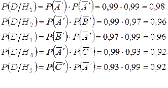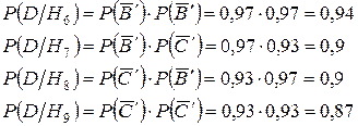 Обозначим через в событие, состоящее в том, что были переданы два символа без искажений. Можно выдвинуть следующие гипотезы: Н1 – переданы символы АА, Н2 – символы АВ, Н3 – символы ВА, Н4 – символы АС, Н5 – символы СА, Н6 – символы ВВ, Н7 – символы ВС, Н8 – символы СВ, Н9 – символы СС. Вероятности этих гипотез: