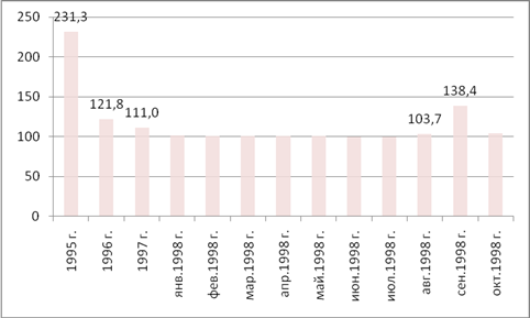 Рисунок 3 – Динамика индекса ИПЦ, % [28] Антиинфляционная политика реформаторских правительств, проводимая с 1995 и до августа 1998 г., помимо безоглядного ограничения денежной массы включала в себя и так называемый безинфляционный метод покрытия дефицита бюджета. Если «замораживание» денежной массы и денежный голод в хозяйстве с самого начала вызывали сомнения, то переход от кредитования бюджета к выпуску государственных долговых обязательств внешне представлялся вполне оправданным и никакой особой критики не вызвал. Напротив, его приветствовали сторонники различных взглядов на проведение реформ в России. Начиная с 1995 г. выпуск государственных ценных бумаг стал главным источником покрытия дефицита федерального бюджета. В течение 1995 – 1996 гг. все обстояло относительно благополучно, но затем система, что называется «начала давать сбои». Главной причиной конечного провала «цивилизованного» покрытия дефицита бюджета стало рассогласование и даже противоречие двух направлений финансовой политики: денежной и бюджетной. Денежная политика вела к падению производства и объемов доходов, а бюджетная исходила из предполагаемого возрастания хотя бы номинального объема доходов. В первые три года высокой инфляции (1992 – 1995 гг.) такое сочетание еще наблюдалось, но затем сокращение темпов инфляции, являвшееся главной целью реформаторов, затормозило рост доходов, а нагрузка на бюджет осталась прежней. С другой стороны, объем производства и реальных доходов резко сократился, и для обеспечения традиционной величины государственных расходов потребовались дополнительные, т.е. заемные средства. Их рассчитывали получить на рынке государственных ценных бумаг, и первые два года это вполне удавалось. Но затем ситуация резко ухудшилась. Развитый и бесперебойно действующий рынок ценных бумаг предполагает определенный уровень доходов населения. Сбережения населения являются главной опорой финансовых рынков. Между тем реформаторы сами ликвидировали эту опору либерализацией цен и жесткой денежной политикой. Более или менее существенные денежные средства были только у банков. С ними-то государство и начало игру в ГКО (государственные казначейские обязательства) и ОФЗ (облигации федерального займа). ГКО изначально базировались на очень шаткой основе: они продавались на короткий срок и были высокодоходны. Вот это и предопределило, с учетом падения производства и реальных доходов, судьбу ГКО. Государство быстро подошло к роковой черте: поступления денег от продажи новых выпусков государственных бумаг стали меньше платежей по погашению прежних выпусков (включая, разумеется, и колоссальные проценты). Это произошло уже в конце 1997 – начале 1998 г. Еще один немаловажный дефект антиинфляционной политики в 1996 – 1998 гг. состоял в том, что в России впервые в мировой практике была применена дефляция – сжатие спроса – в условиях экономического спада путем невыплаты заработной платы, пенсий, пособий. Тем самым государство переложило свои финансовые трудности на плечи населения. Дефляция в России способствовала обострению социально-экономических противоречий, которые в конечном итоге усугубили инфляционный процесс. Одной из причин дефляционной политики явилось возведение в ранг официальной догмы либерализма и монетаристской концепции без учета т