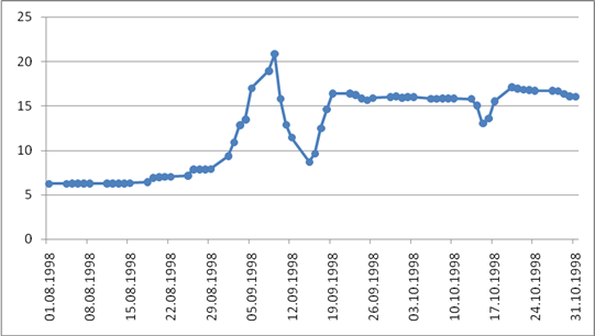 Рисунок 4 – Динамика официального курса рубля по отношению к доллару США [27]. Из диаграммы видно, что курс рубля изменялся в августе – сентябре 1998 г. скачками. При этом необходимо учитывать, что инфляционные последствия скачкообразного изменения курса рубля оказываются гораздо более ощутимыми, чем если бы курс рубля «опускался» постепенно: дополнительно стимулировали рост цен массовое «бегство» от рубля, ажиотажный спрос населения на многие виды товаров и появление локальных товарных дефицитов в разгар кризиса. Объем доходов, аккумулируемых в бюджетной системе, снижается на протяжении последних лет, сделав к 1998 г. практически невозможным нормальное финансирование бюджетной сферы. Периодически проводимые денежные зачеты в разных формах значительно искажали реальную ситуацию с доходами бюджета. Таким образом, инфляционные последствия финансового кризиса весьма ощутимы. Это проявляется особенно рельефно, если учесть, что последовательное снижение темпов инфляции и относительное (с учетом инфляции) укрепление рубля являлись наиболее заметными достижениями в результате семи лет реформ. Валютно-финансовый кризис 1998 г., давший толчок новому витку инфляции, доказал неэффективность монетаристских методов подавления инфляции. Становится очевидным, что для сдерживания темпов роста инфляции требуется комплексный подход к антиинфляционной политике. В течение последних шести лет Центробанк вместе с Министерством финансов России активно проводил политику сдерживания цен, которая основывалась на принципах «стерилизации». Другими словами, она состояла из рублевых заимствований денежных средств из обращения для сокращения ликвидности и последовательном искусственном снижении курса доллара на внутреннем рынке. С 2000 по 2004 гг. с проведением последовательной политики по сдерживанию роста цен ИПЦ уменьшился с 20,2 до 11,7% [5]. Повышение норм обязательных резервов для банков снизило объем денег в экономике. Требование обеспечения рублевых резервов для валютных активов привело к увеличению продажи валюты, что стабилизировало рубль и повысило предложение рублевых средств. Тем не менее, достижение устанавливаемых целевых показателей по инфляции в последние годы успешным назвать никак нельзя. Целевой уровень 2005 г. – 8,5% (фактически потребительские цены выросли на 10,7%), 2006 г. – также 8,5%, получилось 9%. Цель 2007 г. (8%) тоже не была достигнута [6]. Доктор экономических наук М.Ю. Малкина обнаруживает «закономерность инфляционного процесса в России – его цикличность, имеющая естественное происхождение и никаким образом не связанная с цикличностью денежно-кредитного регулирования» [15]. М.Ю. Малкина выделяет три случая усиления инфляционного процесса: взрыв 1992 – 1993 г.; инфляционный процесс, инициированный кризисом августа 1998 г.; увеличение темпов инфляции на рубеже 2004 – 2005 гг. Все три случая усиления инфляционного процесса связаны с предшествующим накоплением дисбаланса в той или иной системе. Цикличность инфляционных процессов в российской экономике (1992, 1998, 2004 гг.) говорят о том, что в экономике действуют свои механизмы накопления скрытой инфляции, которая достигнув границы меры, превращается в открытый инфляционный процесс. В современной России стала преобладать инфляция, вызванная чрезмерными издержками (по сравнению с инфляцией сп