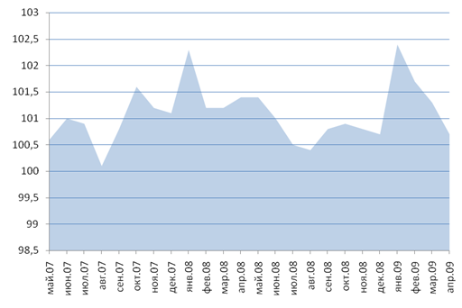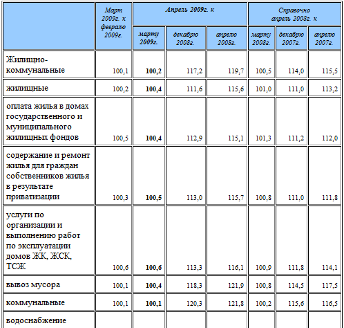 Рисунок 5 – Динамика ИПЦ за период с мая 2007 г. по апрель 2009 г. [28] В первую очередь, это связано с подорожанием услуги (рис.6) и, прежде всего, ростом цен на услуги ЖКХ и естественных монополий (см.приложение 2). Определяя рост тарифов на услуги ЖКХ в качестве фактора высокой инфляции в 2008 – 2009 годах, необходимо назвать и причины, почему такое стало возможным. Во-первых, тарифы на коммунальные услуги, как правило, пересматриваются в сторону увеличения почти во всех регионах с января месяца. Вторая причина, собственно порождающая первую, заключается в том, что инвестиционные потребности обветшалого ЖКХ в последние годы были всегда значительными. Тем не менее, только накачиванием в эту сферу финансовых ресурсов проблему не решить. Нужна конкуренция, а рост тарифов хоть и должен быть с превышением инфляции, но его требуется сдерживать.