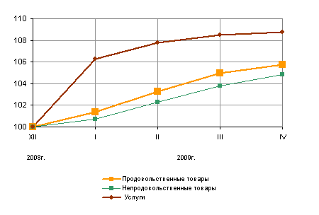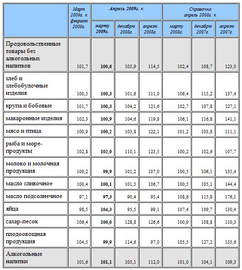 Рисунок 6 – Индексы потребительских цен на товары и услуги на конец периода, в % к декабрю [28] Данные выводы еще раз подтверждает следующая таблица. В течение первых четырех месяцев наиболее высокий индекс инфляции наблюдается на услуги (8,5% в 2008 г. и 8,7% – 2009 г.), но уже в целом по году наиболее высокими темпами растут цены на продовольственные товары (в 2008 г. они выросли на 16,5%). Наиболее стабильное положение отмечается на рынке непродовольственных товаров, за четыре месяца текущего года цены на непродовольственные товары выросли на 4,8%, за аналогичный период предыдущего года – на 2,9%. Таблица 2 – Индекс потребительских цен по группам товаров и услуг, % [28]