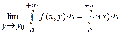 В этом пункте мы рассмотрим предельный переход под знаком интеграла, имеющего бесконечный предел, и непрерывность интеграла как функции параметра. Условия, достаточные для допустимости предельного перехода, даются следующей теоремой: