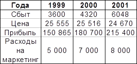 5.3. Цена. Придерживаясь общей методике расчёта цены, при её определении будем следовать следующему плану: 1. Постановка задачи ценообразования; 2. Определение спроса; 3. Прогноз издержек; 4. Анализ цен и товаров конкурентов; 5. Выбор метода ценообразования; 6. Установление окончательной цены. Нашей задаче будет являться следующее: С одной стороны мы, конечно, хотим получать максимальную прибыль, с другой стороны мы не хотим привлекать на наш сегмент рынка конкурентов и терять клиентуру. Исходя из этого при определении цены, будем использовать метод "средней издержки плюс прибыль", но также не будем забывать о ценах конкурентов. Спрос на нашу продукцию не эластичен, так как наша товар не имеет замены, его купят столько сколько нужно, не больше, не меньше (купят не обязательно у нас, могут и у конкурентов). Планируемые издержки и прогноз их изменения мы рассчитали в пункте 5.2. Рассчитаем цену. На все три года предположим прибыль равную 15%, тогда цена с учётом себестоимости будет: P(1999) = S(1999) + S(1999) * 0.15 = 25 550 P(2000) = S(2000) + S(2000) * 0.15 = 25 160 P(2001) = S(2001) + S(2001) * 0.15 = 24 600 Получившаяся цена немного выше, чем у конкурентов, примерно на 3 - 4 %, но это не страшно, так как самый ближайший к нам конкурент (с географической точки зрения) находится в другом городе. Значит покупка товара у них, будет означать повышенные расходы на транспортировку. Поэтому, мы считаем, что потребители нашего сегмента будут покупать наш товар. 5.4. Прибыль безубыточности.