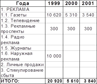 Точка безубыточности определяется по формуле: X = Sуп(за год) / ( P(ед. прод.) - Sпер(ед. прод.)) 6. ПЛАНИРОВАНИЕ МАРКЕТИНГОВОГО БЮДЖЕТА. 6.1. Продвижение и реклама ( c примером). Предлагаемый нами товар является товаром промышленного назначения. У нас строго определённые покупатели. Это, прежде всего, строительные фирмы (государственные или частные) и, совсем маленький сегмент покупателей, которые строят дома сами себе. Поэтому рекламную компанию будем, прежде всего, ориентировать на строительные фирмы. Реклама по телевидению нам не подходит, так как в телевизионной рекламе очень низкая избирательность аудитории и очень высокая стоимость рекламного контакта. Реклама по радио, тоже не принесёт желаемого результата, (местное радио не имеет популярности, а среди слушателей таких радиостанций, как, например, "Европа +" наших потенциальных клиентов практически нет). Наиболее эффективной для нашего товара рекламой, на наш взгляд, является реклама напечатанная в местной газете ("Калининградская правда"). Эта реклама относительно не дорога (стоимость 20 букв - 30 рублей). Среди сотрудников строительных фирм, ведущих строительство в нашем городе, большинство проживают в нашем городе, а, следовательно, велика вероятность того, что они читают местную газету и рекламный контакт может состояться. Также мы планируем разместить нашу рекламу на щитах. Один рекламный щит будет находиться рядом с основным входом на территорию нашего производства, а другой при въезде в наш город с Ярославского шоссе (таким образом, чтобы информация на нём была легко читаема для проезжающих мимо). 6.2. Распространение товара. Мы будем распространять наш товар по каналу прямого маркетинга, так как производимые нашей фирмой металлоконструкции делаются на заказ (по чертежам заказчика). Для готовой продукции, которую заказчик сразу забрать не может, нам потребуются складские помещения. Для этого нам нужно около 3000 квадратных метров площади. Для этих целей мы будем использовать часть производственных площадей (производство на полную мощность не работает, поэтому места будет достаточно). Также нам потребуются производственные запасы для бесперебойной работы. Их мы буде хранить там же, где и готовую продукцию.