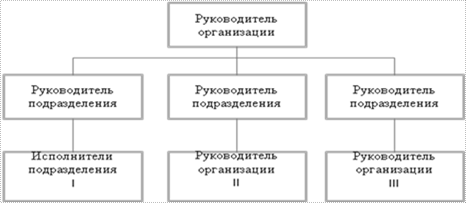 Рис. 2.4. Связь целей организации с основными категориями теории управления 2.2 Структуры организацииЛинейная структура. При линейной структуре управления руководители подразделений низших ступеней непосредственно подчиняются одному руководителю более высокого уровня управления и связаны с вышестоящей системой только через него. При такой организации управления, когда один руководитель отвечает за весь объем деятельности и передача управленческих решений каждому из подразделений одного уровня происходит только от одного начальника, в наибольшей степени осуществляется принцип единоначалия. Руководитель, таким образом, несет полную ответственность за результаты деятельности подчиненных ему подразделений (рис. 2.5). Доминирующим принципом построения линейной структуры служит вертикальная иерархия, обеспечивающая простоту и четкость подчинения. Вместе с тем здесь есть и определенные трудности. Каждый руководитель при линейной структуре обязан быть высококвалифицированным специалистом, обладающим разносторонними знаниями, необходимыми для выполнения комплекса работ по управлению производством. В условиях современного уровня развития производительных сил, масштабов производства и высокой технической оснащенности эта задача становится все труднее: увеличиваются число уровней управленческой иерархии, количество подчиненных подразделений, а вместе с этим и их различная функциональная направленность. При таких условиях линейная структура в чистом виде применятся не может, так как она приспособлена лишь к решению оперативных текущих задач. Отсутствие гибкости и адаптивности не позволяет ей решать комплексные задачи, обусловленные постоянно меняющимися целями функционирования. Это делает необходимыми введение специальных органов для выполнения той или иной функции на всех уровнях управленческой структуры управления.