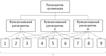 Рис. 2.5. Линейная структура управления Функциональная структура . Для нее характерно создание структурных подразделений, каждое из которых имеет свою четко определенную, конкретную задачу и обязанности. Следовательно, в условиях данной структуры каждый орган управления, а также исполнитель специализирован на выполнении отдельных видов управленческой деятельности (функций). Создается аппарат специалистов, отвечающих только за определенный участок работы. В основе функциональной структуры управления лежит принцип полного распорядительства: выполнение указаний функционального органа в пределах его компетенции обязательно для подразделений. Решения по общим вопросам принимаются коллегиально. Достоинства функциональной структуры управления можно свести к следующему: ¨ высокая компетентность специалистов, отвечающих за выполнение конкретных функций: ¨ специализация подразделений на выполнении определенного вида управленческой деятельности, ликвидация дублирования в выполнении задач управления отдельными службами; ¨ освобождение линейных менеджеров от решения многих специальных вопросов и расширение их возможностей по оперативному управлению производством; ¨ создается основа для использования в работе, консультаций опытных специалистов, уменьшается потребность в специалистах широкого профиля. В качестве недостатков этого вида организационной структуры управления назовем: ¨ нарушение принципом полноправного распорядительства принципа единоначалия; ¨ длительную процедуру принятия решений; ¨ трудности поддержания постоянных взаимосвязей между различными функциональными службами; ¨ снижение ответственности исполнителей за работу, поскольку каждый исполнитель получает указания от нескольких руководителей; ¨ несогласованность и дублирование указаний и распоряжений, получаемых исполнителями «сверху»; ¨ каждый функциональный руководитель и функциональное подразделение ставят свои вопросы на первое место, недостаточно согласовывая их с необходимостью достижения поставленных перед компанией целей; ¨ отсутствие взаимопонимания и единства действий между функциональными службами. В определенной степени способствуют ликвидации недостатков линейной и функциональной организационных структур так называемые линейно-штабная и линейно-функциональная структуры управления, предусматривающие функциональное разделение управленческого труда в подразделениях разных уровней и сочетание линейного и функционального принципов управления. В этом случае функциональные подразделения могут проводить свои решения либо через линейных руководителей (в условиях линейно-штабной структуры), либо в пределах специальных полномочий прямо доводить их до специализированных служб или отдельных исполнителей на нижестоящем уровне (в условиях линейно-функциональной структуры управления. (Рис.2.6)