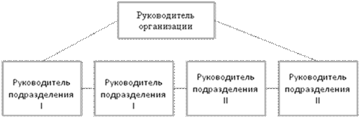 Рис. 2.1 Плоская структура управления организацией И управленческий труд – специализированный вид труда. Внутри него тоже происходит специализация – разделение на конкретные виды управленческого труда, в результате чего выделяются уровни управления. Важным понятием является сфера контроля. Сфера контроля – это группа лиц, непосредственно подчиненных одному руководителю. Сфера контроля может быть широкой и узкой. Если руководитель контролирует большое количество подчиненных, то у него широкая сфера контроля. Если каждому руководителю подчиняется немного людей, то это узкая сфера контроля. Сфера контроля определяет тип организационной структуры. Широкая сфера контроля дает плоскую структуру управления (рис. 2.2), с небольшим числом уровней управления, узкая сфера контроля – многоуровневую (или высокую) структуру.