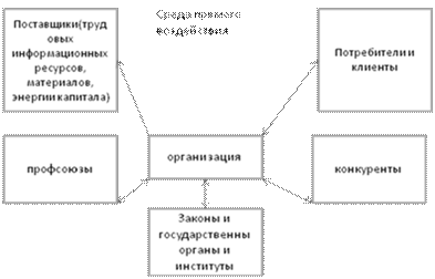 Рис. 2.9. Матрично-штабная структура управления 3. Внешняя среда организацииПонимание важности оценки внешней среды при управлении деятельностью предприятия окончательно сформировалось в конце 50-х гг., так как внешнее окружение организации все больше становилось и является по сей день источником многих проблем руководителей. Организация, как открытая система зависит от поставок ресурсов, энергии, кадров, а также потребителей. В общем, внешнюю среду организации можно охарактеризовать как всю совокупность факторов, влияющих на деятельность организации, а именно: потребители, конкуренты, правительственные учреждения, поставщики, финансовые организации, источники трудовых ресурсов, а также наука, культура, состояние общества и природные явления. Поскольку факторы внешней среды имеют различную силу влияния на организацию, их разделяют на прямые и косвенные факторы, а всю внешнюю среду на среду прямого и косвенного действия. Потребители - это те лица, которые заинтересованы или могут быть заинтересованы производимыми организацией товарами или услугами. Известный специалист в области управления П. Друкер считал, что единственная подлинная цель любого бизнеса - это создание потребителя. Необходимость удовлетворять потребности покупателя влияет на процессы внутри организации, так как количество потребителей определяет, в конечном итоге, необходимые производственные ресурсы, а характеристика потребителей (какие они) - необходимый ассортимент товаров и услуг и их качество. Принципиально всех потребителей можно разделить на четыре большие группы: · конечные потребители, или население; · промышленные потребители, представители различных отраслей хозяйства; · посредники или торговые организации, которые приобретают товар для перепродажи; · государство, как хозяйствующий субъект. Важной составляющей внешней среды являются конкуренты. Каждый руководитель должен осознавать, что если он не будет удовлетворять своих потребителей также эффективно (с определенными качеством и ценой), как и его конкуренты, то долго предприятие в рыночных условиях существовать не сможет. Под конкурентами подразумеваются не только те компании, которые предлагают такие же товары, но с другой маркой, но и компании, выпускающие заменители. Таким образом, у любой организации существуют два вида конкурентов: · прямые конкуренты - производители аналогичных товаров (например, Coca-Cola и Pepsi-Cola); · косвенные конкуренты - производители заменителей (например, Coca-Cola и пиво Балтика). Для ведения хозяйственной деятельности каждой компании нужны внешние поставки: сырье, материалы, трудовые ресурсы, капитал. В этом случае возникает прямая зависимость между организацией и сетью поставщиков, обеспечивающих поставки указанных ресурсов. На рынке закупок организацию больше всего интересуют условия получения ресурсов, а именно: цена, качество и условия поставки (сроки, объемы, условия платежа и т. д.). Именно эти тенденции на рынке закупок влияют на общий товарооборот предприятия. Некоторые общественные организации также оказывают непосредственное влияние на деятельность предприятий. Особенно это воздействие усилилось за последние годы. Хорошо известно влияние профсоюзных организаций, которые борются за права работников, тем самым устанавливая баланс отношений 