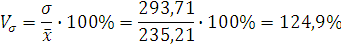 Коэффициент доверия примем равным 1,96 (такое значение гарантирует результат с доверительной вероятностью 0,95). Для определения коэффициента вариации определим среднее арифметическое значение генеральной совокупности – 159,27 человек и среднее квадратическое отклонение – 58,26. В результате получим коэффициент вариации, равный 37%. Зададим величину допустимой относительной предельной ошибки =15%. Следовательно, объём выборки составит: