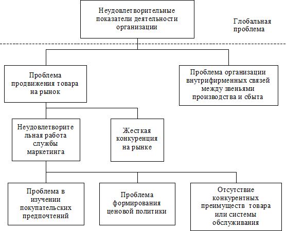 Используя сводную матрицу, можно выявить те цели, которые предприятию необходимо незамедлительно достигать с учетом своих преимуществ и недостатков для увеличения объемов реализации: - использовать свои преимущества на основании положения ведущего производителя на территории Уссурийского района в полную меру как в сфере производства, так и в сфере торговли; - увеличение объемов выпуска и сбыта продукции, используя высокую конкурентоспособность продукции в области ценового и качественного показателей (цена на 7-7 % ниже единой общероссийской цены на аналогичную продукцию); - расширение розничной фирменной торговой сети, как стратегического канала сбыта продукции, в целях получения повышенной прибыли в результате розничной торговой наценки; - использование свободных мощностей для расширения ассортимента производства наиболее рентабельной и пользующейся спросом продукции в целях получения свободных оборотных средств. На сегодняшний день предприятие подвержено существенной конкуренции со стороны производителей на рынке вино водочных изделий. Анализ макроокружения показал, что на предприятие оказывается влияние со стороны правовых органов в сфере обязательного лицензирования деятельности и сертифицирования продукции. Это влияние ощущается в повседневной деятельности, но не несет в себе негативного воздействия и снижения результативности деятельности. Затраты, понесенные предприятием в ходе осуществления перечисленных мероприятий, относятся на снижение прибыли. Политические процессы, происходящие в стране, также оказывают опосредованное воздействие в той мере, в какой снижается покупательная способность населения по отношению ко всем товарам и услугам, и в частности к материалам. Большее по сравнению с предыдущими параметрами влияние оказывает развитие научно-технического прогресса и достижения современных технологий. Это выражается в разработке современных материалов и технологий их производства. Этот процесс снижает конкурентоспособность традиционных строительных материалов и технологий и вытесняет их с рынка. Анализ объектов и субъектов управления проводится в системном единстве с анализом внешней среды. Изучение конкурентной среды позволило выявить тот факт, что непосредственные конкуренты, т.е. производители аналогичной продукции не оказывают сильного воздействия на потребителей, рыночные сегменты поделены приблизительно пропорционально. Существует собственный круг постоянных потребителей в виде крупных предприятий и магазинов. На предприятии обнаружена проблема. Под проблемой понимается критическое рассогласование между желаемым и реальным состоянием. В данном случае это хорошо налаженное производство и плохо поставленный сбыт, тогда как при хорошем производстве не должен отставать и сбыт, чтобы иметь возможность инвестировать свободные финансовые ресурсы в еще большее расширение производства или его усовершенствование. Осознание проблемы состоит в установлении факта ее существования по результатам контроля деятельности или исследования рыночных возможностей. Проблема, достигшая определенной остроты, трансформируется в мотив для деятельности организации и ее менеджеров. Структурировать проблему позволяет процесс построения дерева проблем. Дерево проблем приведено