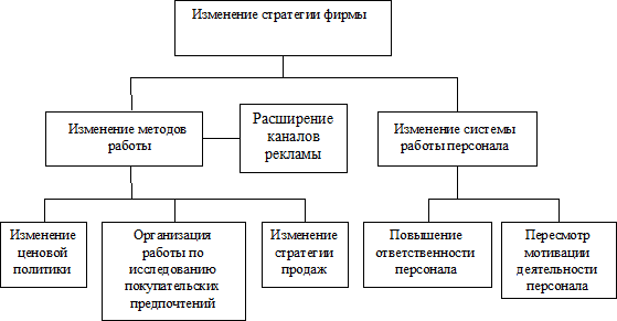 Рис. 1 - Дерево проблем ОАО Уссурийский Бальзам По результатам работы по выявлению проблемы, перед предприятием была поставлена цель – увеличить объемы сбыта готовой продукции и повышение потребительского предпочтения в сторону нашей продукции. Далее, согласно, приведенных материалов о проделанной работе по выявлению проблем, руководством предприятия выявлена наиболее важная для стратегического развития предприятия проблема. Она связана с перестройкой стратегии фирмы. В рамках решения данной проблемы можно выделить несколько направлений ее решения. С одной стороны, это изменение методологического подхода к организации службы маркетинга на предприятии. А с другой стороны, это изменение влияния человеческого фактора на решение проблемы. Можно предложить несколько вариантов решения данной проблемы. Приведу их в виде дерева решений (рис. 2):