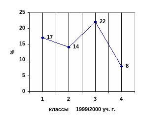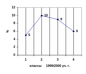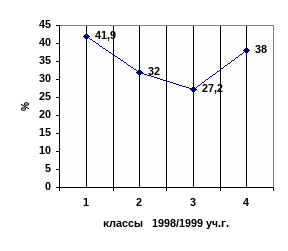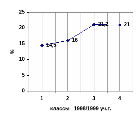5. График негативного отношения, школьной дез.адаптации к школе. 1.2. Динамика изменения школьной мотивации учащихся начальных классов за 2 учебных года. Пофамильные данные учащихся 2-4 классов за 2 учебных года (см. Приложение IV) были сведены в таблицы. Таблица 1а. Динамика изменения школьной мотивации с 1998/1999 уч.г. по 1999/2000 уч.г.