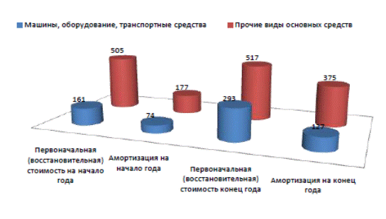 2.2 Анализ структуры, состояния и использования основных производственных фондов Данный раздел включает: анализ объема, структуры и динамики основных фондов; анализ состояния и движения основных производственных фондов; анализ использования основных производственных фондов. Одним из важнейших факторов повышения эффективности производства на промышленных предприятиях является обеспеченность их основными фондами в необходимом количестве и ассортименте и более полное их использование. Состояние и использование основных фондов – один из важнейших аспектов аналитической работы, так как именно они являются материальным воплощением научно-технического прогресса – главного фактора повышения эффективности любого производства. Более полное и рациональное использование основных фондов и производственных мощностей предприятия способствует: росту производительности труда, повышению фондоотдачи, увеличению выпуска продукции, снижению ее себестоимости, экономии капитальных вложений. Анализ начинается с изучения объема основных средств, их динамики и структуры , который проводится способом сравнения путем сопоставления данных на начало и конец отчетного и предыдущего годов. Таблица 4. Динамика состава и структуры основных фондов